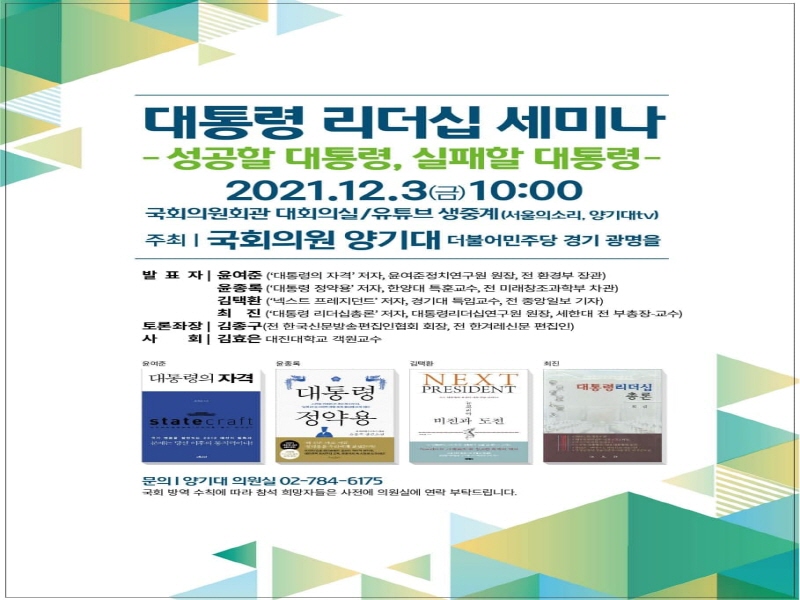 더불어민주당 소속 양기대 국회의원(경기광명을)은 3일 오전 10시 국회의원회관 대회의실에서 ‘성공할 대통령, 실패할 대통령’을 부제로 하는 ‘대통령 리더십 세미나’를 개최한다고 1일 밝혔다.