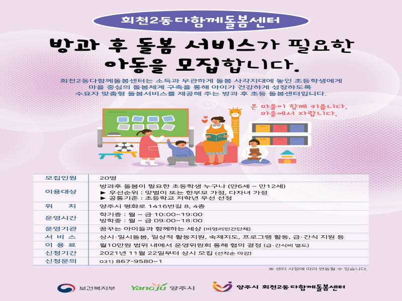 한편 양주시는 지난해 6월 양주시여성일균형지원센터 1층에 다함께돌봄센터 1호점 ‘회천3동 다함께돌봄센터’를 열고 방과 후 초등돌봄 서비스 제공하고 있다.