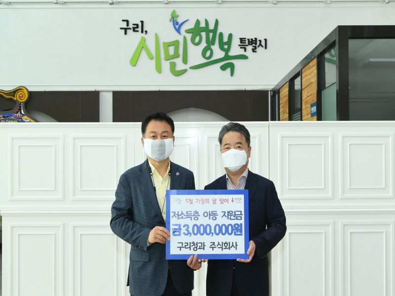 구리시(시장 안승남)는 지난 7일 복지회의실(2층)에서 구리청과 주식회사(대표 이석우)로부터 가정의 날을 맞아 관내 취약계층 아동을 위해 사용해 달라며 성금 3백만 원을 전달받았다.