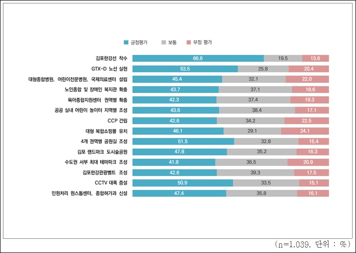 김포시는 27일 ‘2022 김포시정 일반 만족도 조사’를 발표했다. 만족도 산출 모형으로는 각 조사항목별 ‘5점 척도(각 점수 100점 만점 환산 계산)’가 사용됐다. 그 결과, 김포시 역점사업 평가 중 ‘김포한강선 착수(서울 지하철 5호선 연장)’ 사업에 대해 “잘하고 있다”는 응답은 66.6%(3.70점)으로 가장 높은 만족도로 집계됐다. 이어 GTX-D 노선 실현 53.5%(3.43점), 대형종합병원·어린이전문병원·국제의료센터 설립 45.4%(3.29점), 노인종합 및 장애인 복지관 확충 43.7%*3.29점) 순으로 조사됐다.