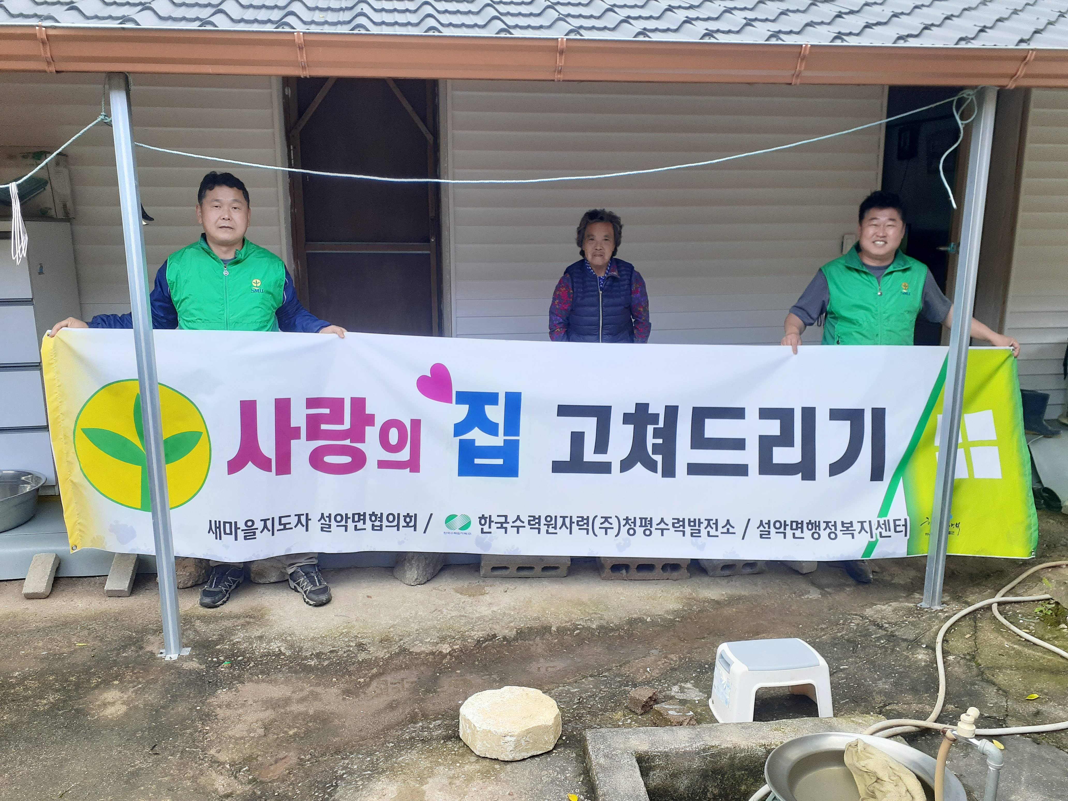 설악면 새마을지도자협의회에서 윤양근 새마을회장과 설악면행정복지센터의 행정지원을 통한 저소득가정 3가정이 12월 19일까지 집수리사업지원을 받아 따듯한 한해를 마감하게 되었다. 이 사업은 매년 한수원(주)청평수력발전소의 사업자지원사업을 통하여 진행되는 가운데 복지행정의 사각을 보조함으로 인하여 해당 가정에 많은 도움이 되는 것으로 알려져 매우 뜻깊은 지원 사업으로 인정받고 있다.
