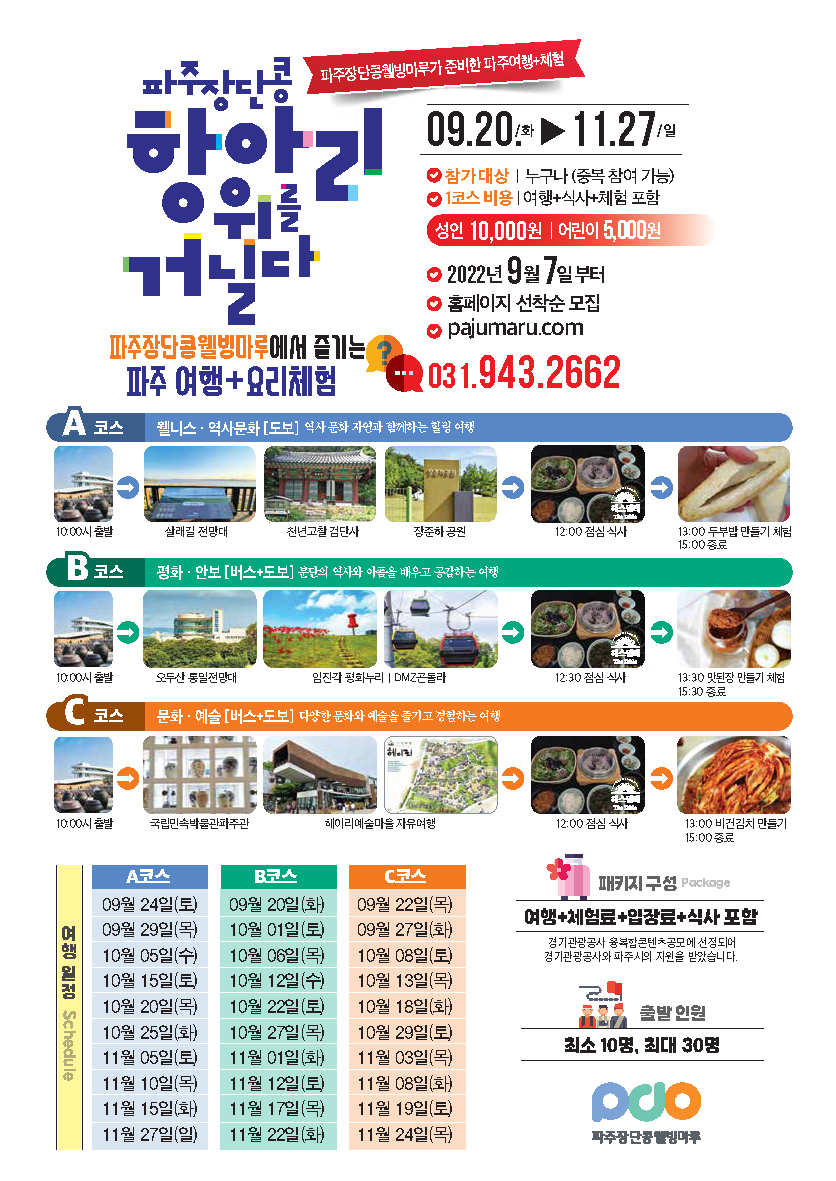 파주시 출자기관인 ㈜파주장단콩웰빙마루에서는 역사·문화·생태·평화 투어 프로그램인 ‘파주장단콩 항아리 위를 거닐다’의 각 코스별 신청자 30명을 선착순으로 모집한다.