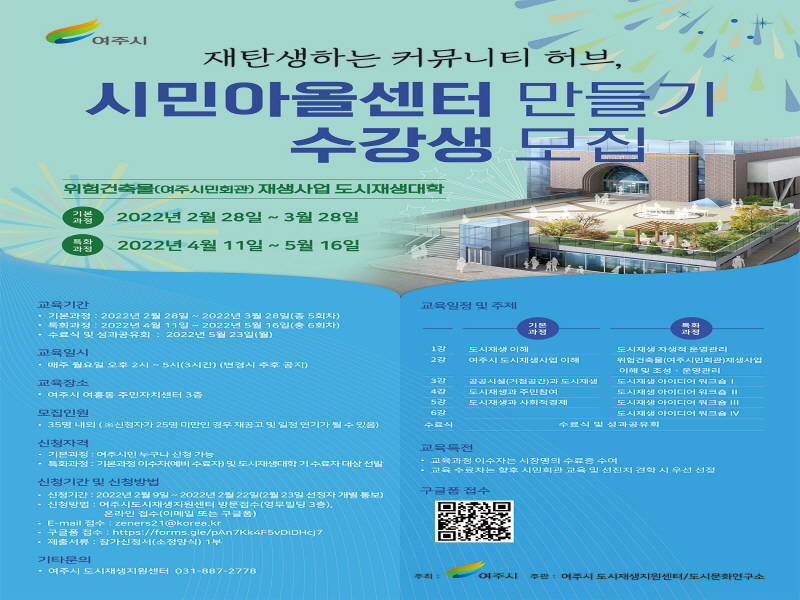 신청자격은 위험건축물(여주시민회관)재생사업에 관심있는 여주시민 누구나 수강신청이 가능하며, 신청방법은 여주시 홈페이지에서 신청서를 내려받아 작성한 뒤 이메일(zeners21@korea.kr)로 전송하거나 도시재생지원센터로 방문 접수, 포스터 내 QR코드를 통한 온라인 접수 등으로 신청하면 된다.