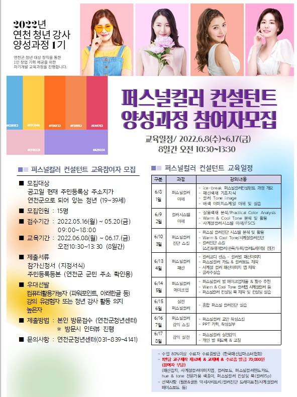연천군청년센터는 오는 16일부터 20일까지 지역 청년 강사를 양성하는 퍼스널 컬러 컨설턴트 양성과정 교육참여자를 모집한다.