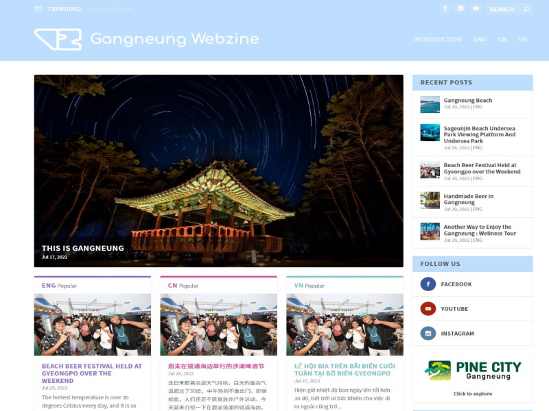 강릉시 외국어 E-뉴스레터는 이메일 발송용 뉴스레터와 웹진(Web Magazine) 두 가지 형식으로, 영어‧중국어‧베트남어 총 3개 국어로 제작된다.