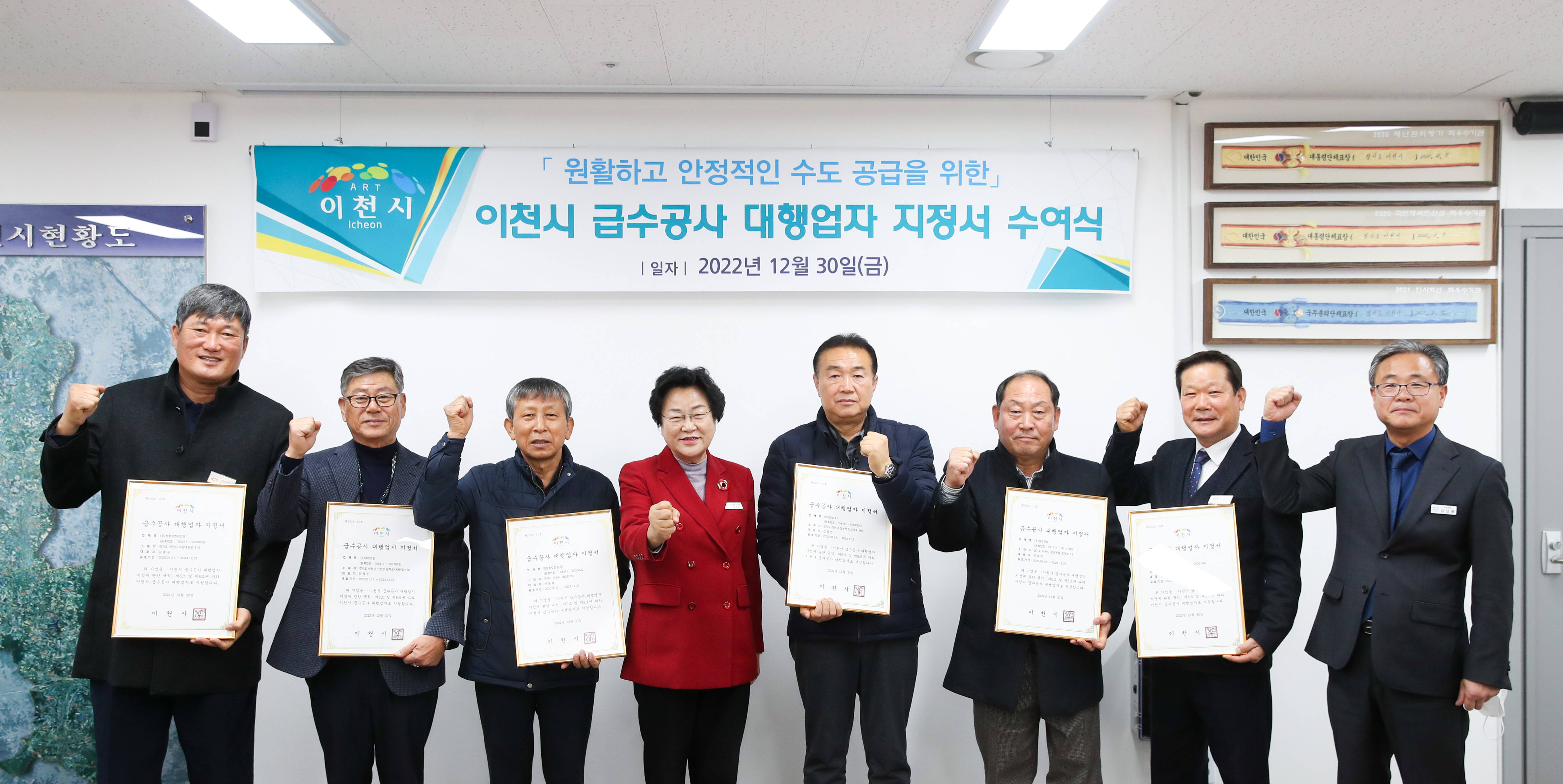 12월 30일 이천시청 5층 다올실에서는 지난 19일 선정 완료된 2023년도의 급수공사 대행업자에 대한 지정서 수여식이 있었다.