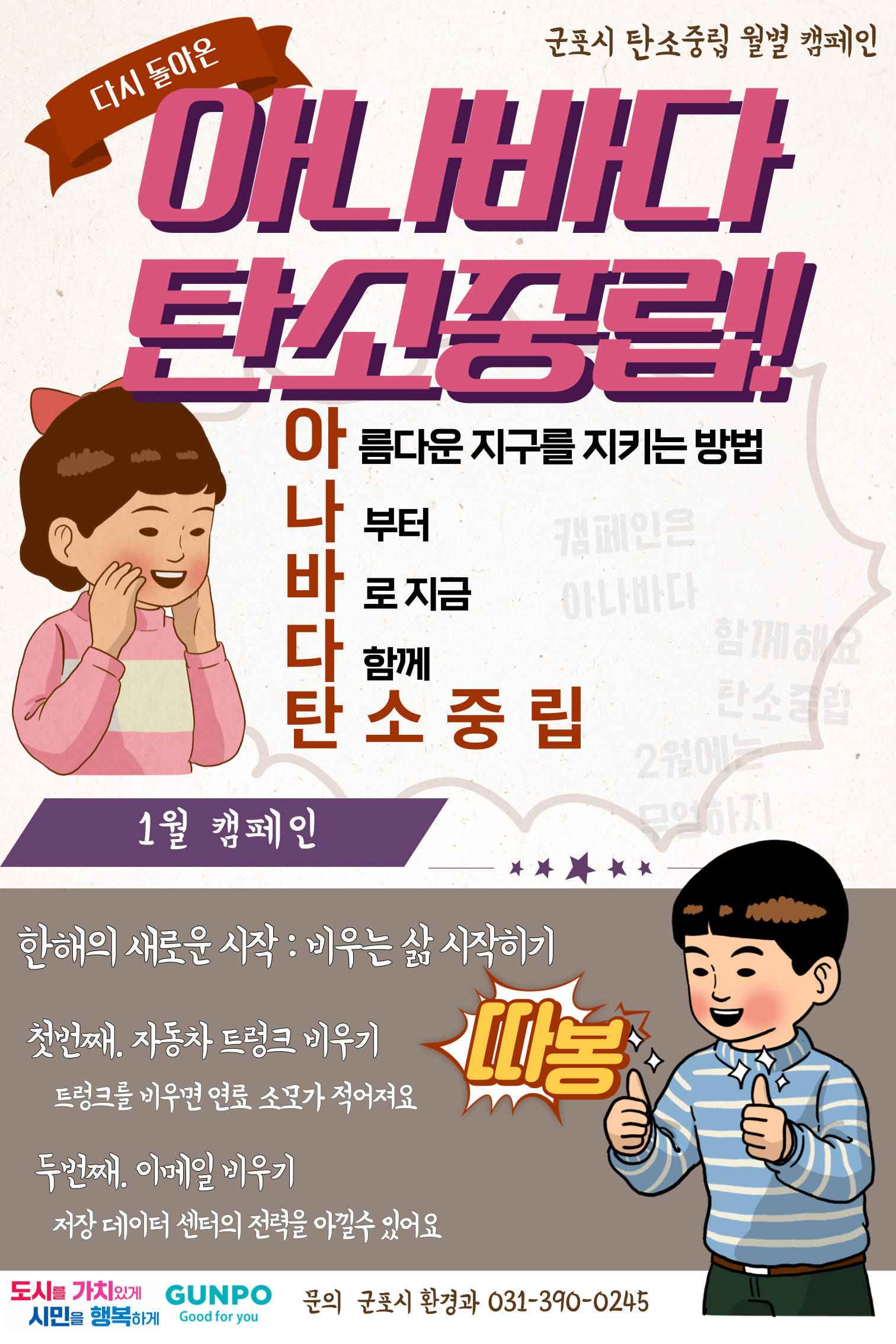 이번 1월의 주제는 ‘한 해의 새로운 시작, 비우는 삶 시작하기’이며 자동차 중량 감소를 통해 사용 연료를 감소할 수 있는 자동차 트렁크 비우기와 불필요한 데이터 저장으로 인한 데이터 센터 사용 전력량을 감소시키기 위한 활동인 이메일 비우기 실천 캠페인을 시행한다.