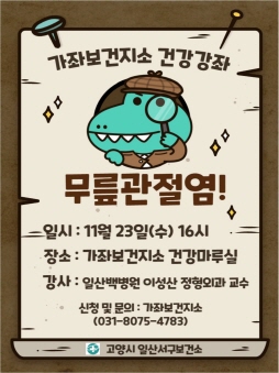 일산서구보건소 가좌보건지소 관계자는 “무릎관절염은 생활습관으로 인해 악화되는 경우가 많다. 이번 기회를 통해 일상생활에서 통증을 완화시킬 수 있는 방법을 아시길 바란다.”고 말했다.