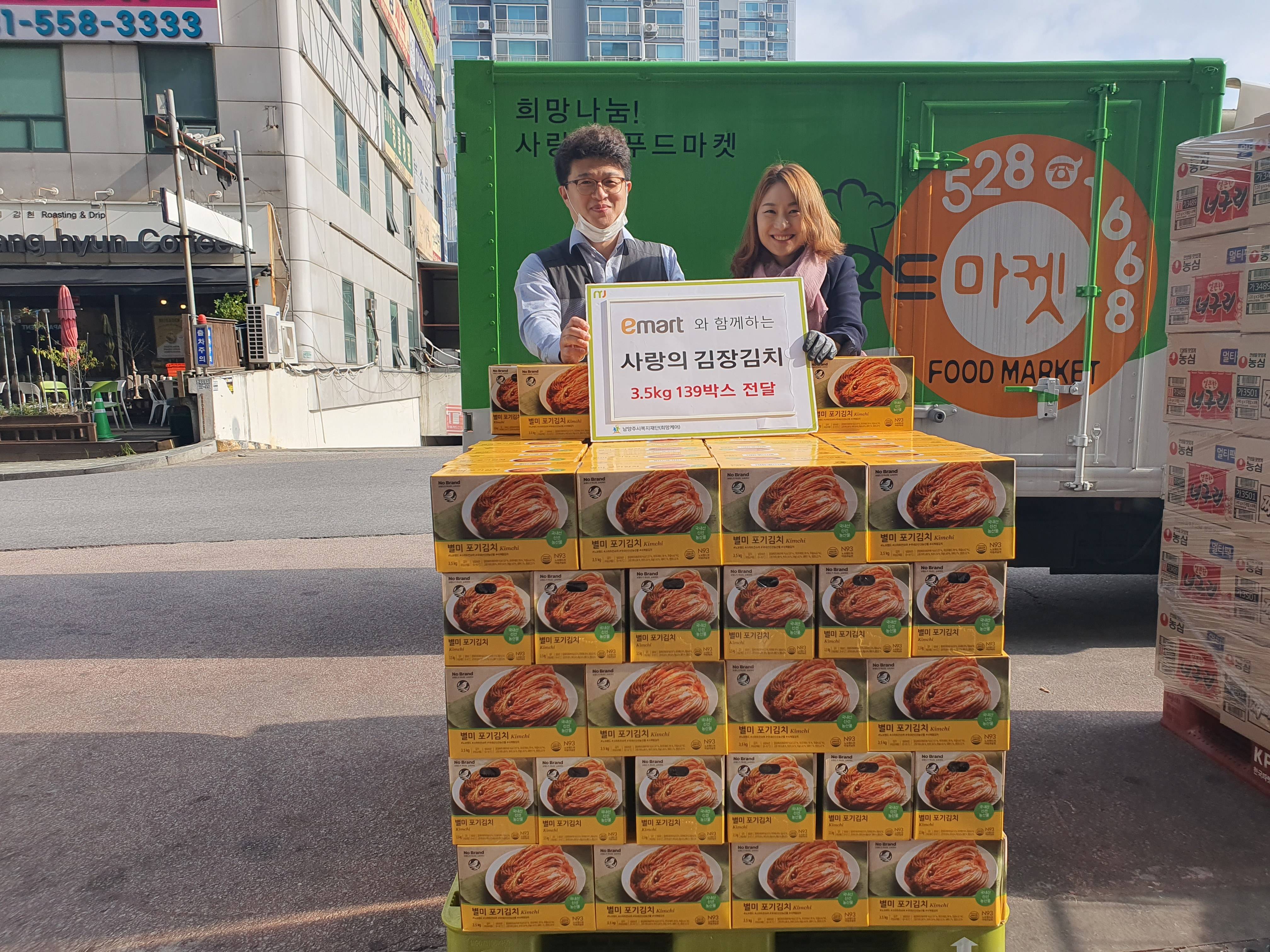 남양주시 다산동에 위치한 이마트 다산점(점장 김봉규)은 지난 17일 다산동에 거주하는 어려운 이웃들을 위해 300만 원 상당의 김치 139박스(3.5kg)를 남양주시 서부희망케어센터(신영미 센터장)에 전달했다.