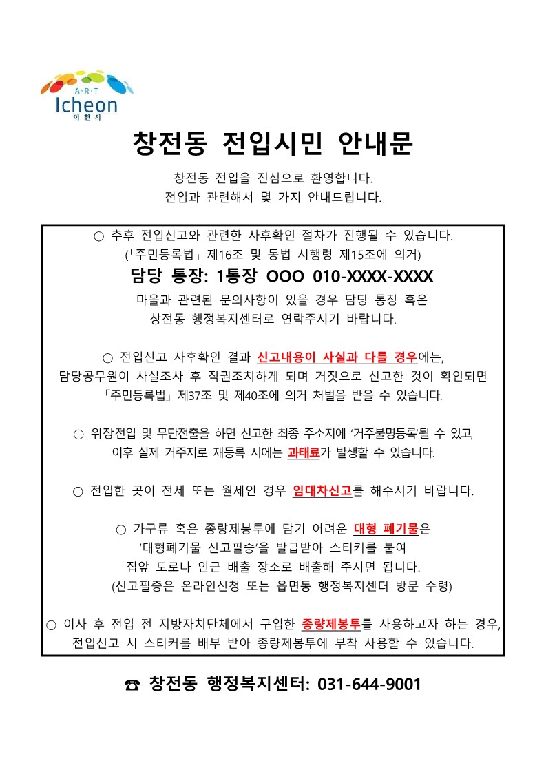 창전동은 2023년 1월부터 전입시민에 대해 해당 주소를 관할하는 통장 연락처 등의 전입 관련 안내사항을 담은 “전입시민 안내문”을 배부한다.