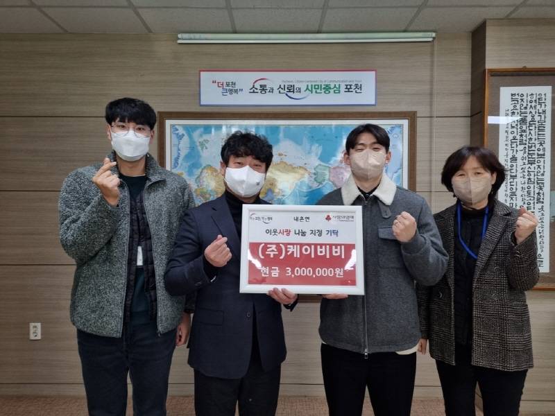 포천시 내촌면 소재 ㈜케이비비(대표이사 이창식)에서 지난 30일 관내 복지취약계층에 뜻깊게 써달라며 성금 300만 원을 사회복지공동모금회에 기탁했다.