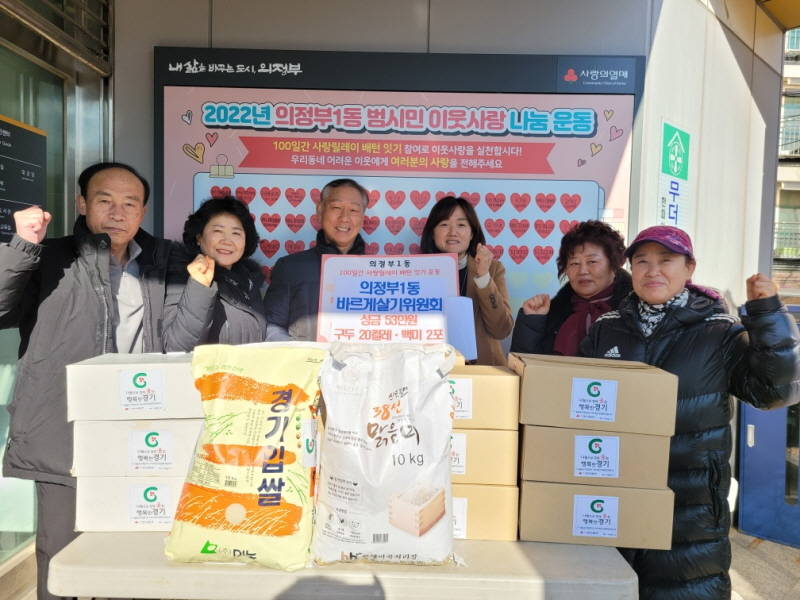 의정부시 의정부1동주민센터는 12월 30일 바르게살기위원회(위원장 이중희)가 쌀쌀한 날씨에도 주민센터를 방문해 성금 53만 원, 구두 20켤레, 백미 10kg 2포를 기탁했다고 밝혔다.