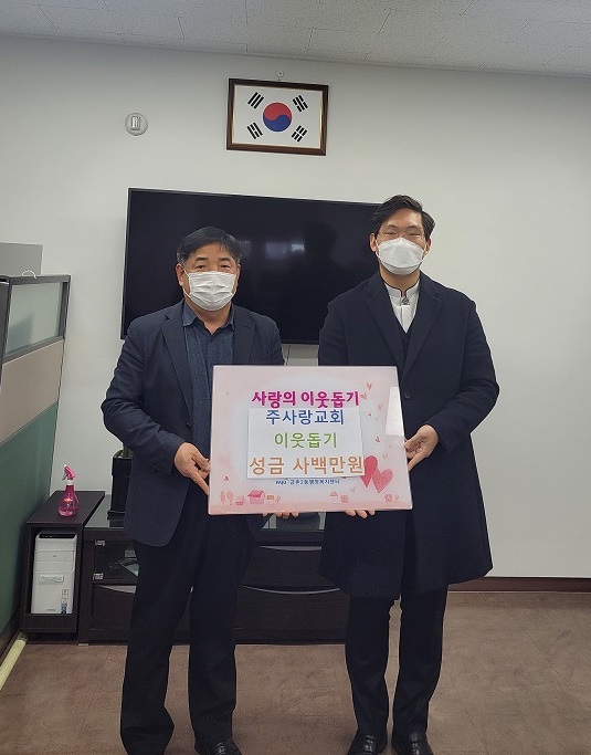 파주시 금촌2동(동장 윤병렬)은 29일 주사랑교회(담임목사 최정도)에서 성금 4백만원을 기탁받았다고 밝혔다.주사랑교회는 지난해에 이어 올해도 성금 4백만원을 후원했으며, 코로나19 이전에는 매년 소외된 이웃들에게 ‘사랑의 쌀’을 전달하며 이웃사랑을 실천했으나, 코로나19 이후 대면으로 전달하는 것이 어려워져 성금을 모아 기탁하게 됐다.