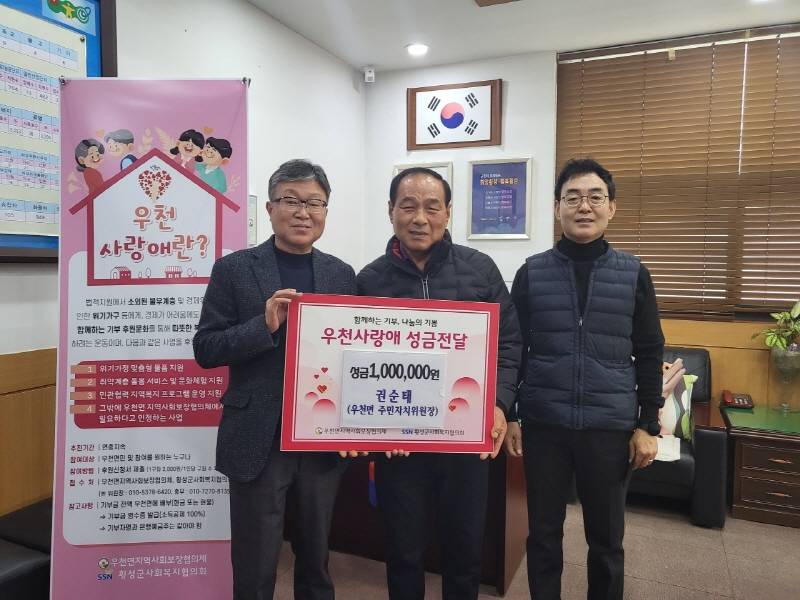 기탁된 성금은 우천면 <사랑애>기금으로 적립되어 2023년 어려운 이웃을 및 소외된 취약계층을 위해 사용된다.