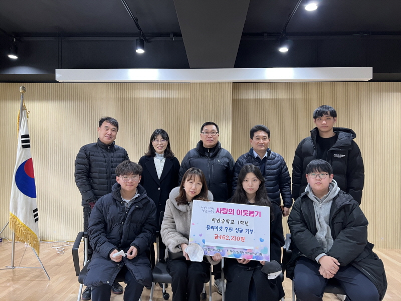 광명시 하안2동 지역사회보장협의체에 하안중학교 1학년 학생 일동이 새해를 맞아 지난 2일 플리마켓 수익금 46만여 원을 기부했다.
