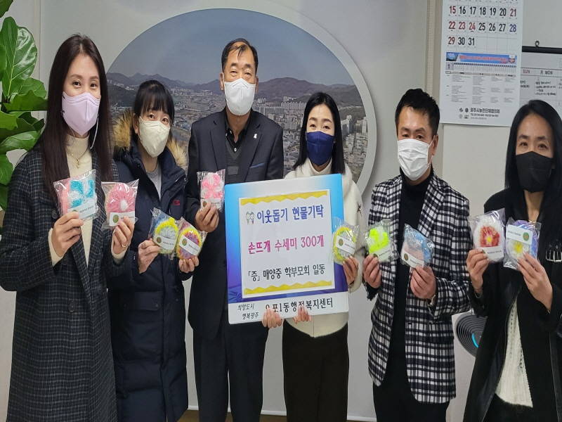 매양중 학부모회 회원들은 지난달 28일 광주시 오포1동 행정복지센터를 방문, 직접 만든 손뜨개 수세미 300개를 전달했다.