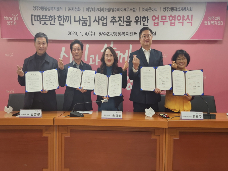 양주시 양주2동 행정복지센터(동장 송미애)는 지난 4일 (주)자성화(대표 김영배), 어부네코다리조림 양주레이크우드점(대표 서민구), ㈜라온아띠(대표 강세구), 양주2동 적십자봉사회(회장 문을숙)와 ‘따뜻한 한끼 나눔’사업 추진을 위한 업무협약을 체결했다고 밝혔다.