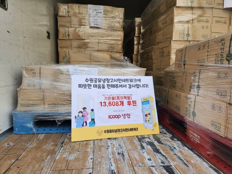 수원아이쿱생협‧수원미래아이쿱생협과 kt wiz가 ‘No 플라스틱 캠페인’ 확산을 위해 수원시 공유냉장고 32곳에 1월 5일, 1만3608개를 추가로 전달하며 총 3만9천여개의 종이팩물(기픈물)을 기부했다.
