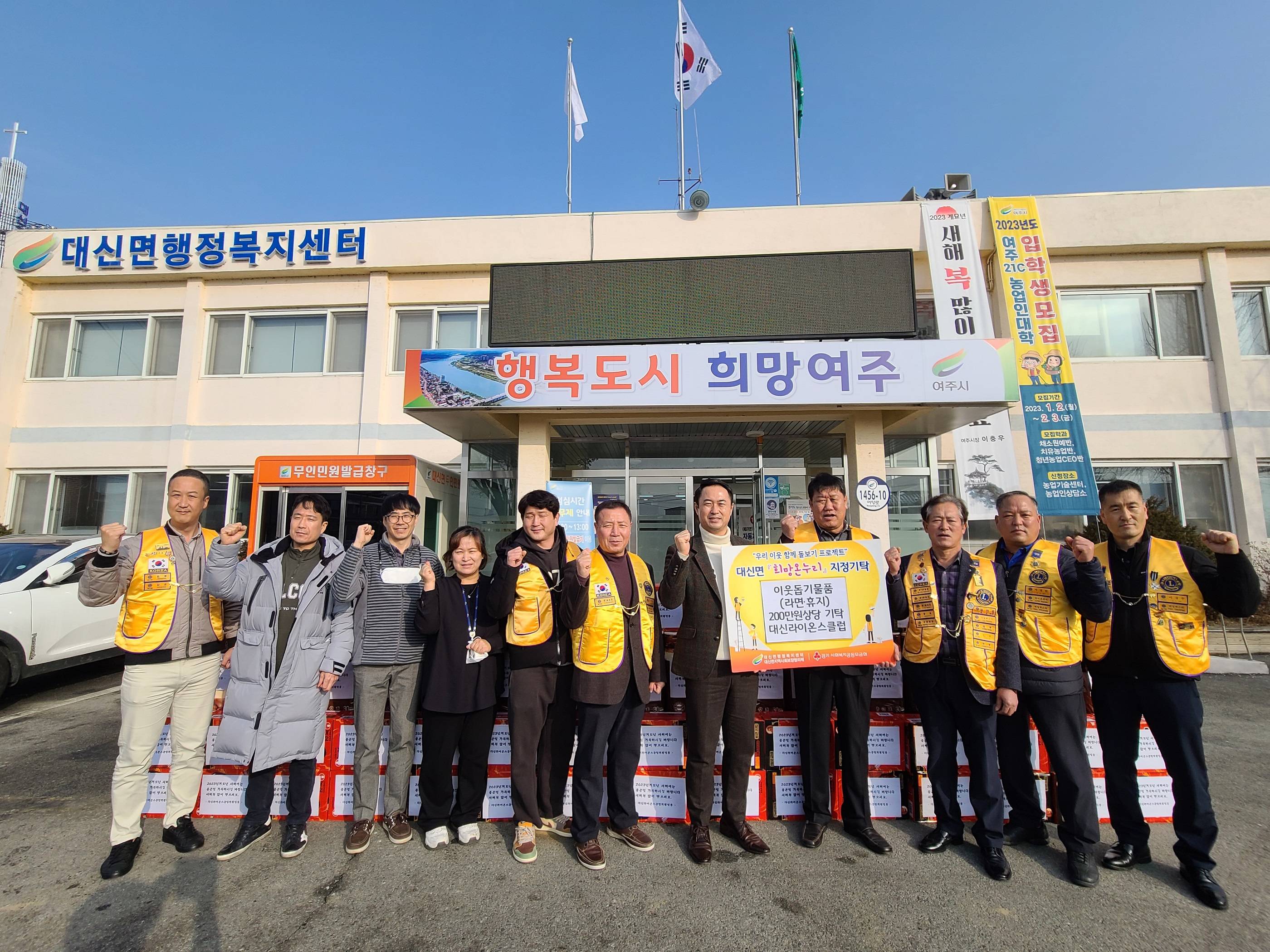 1월 9일(월) 대신면행정복지센터(면장:김연석)는 대신라이온스클럽(회장 : 김현관)에서 설명절 맞이 이웃돕기물품(라면․휴지 200만원 상당)을 기탁받았다.