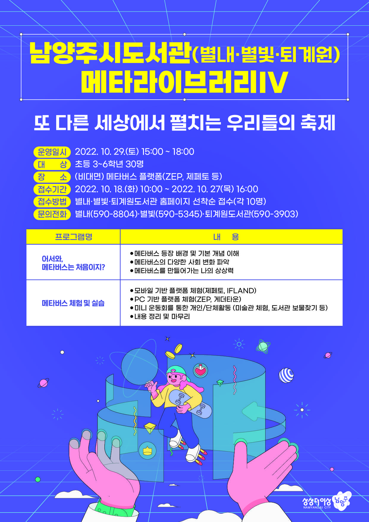 남양주시 별내·별빛·퇴계원도서관은 오는 29일 지역 내 어린이 30명을 대상으로 메타라이브러리Ⅳ ‘또 다른 세상에서 펼치는 우리들의 축제’를 운영한다고 18일 밝혔다.