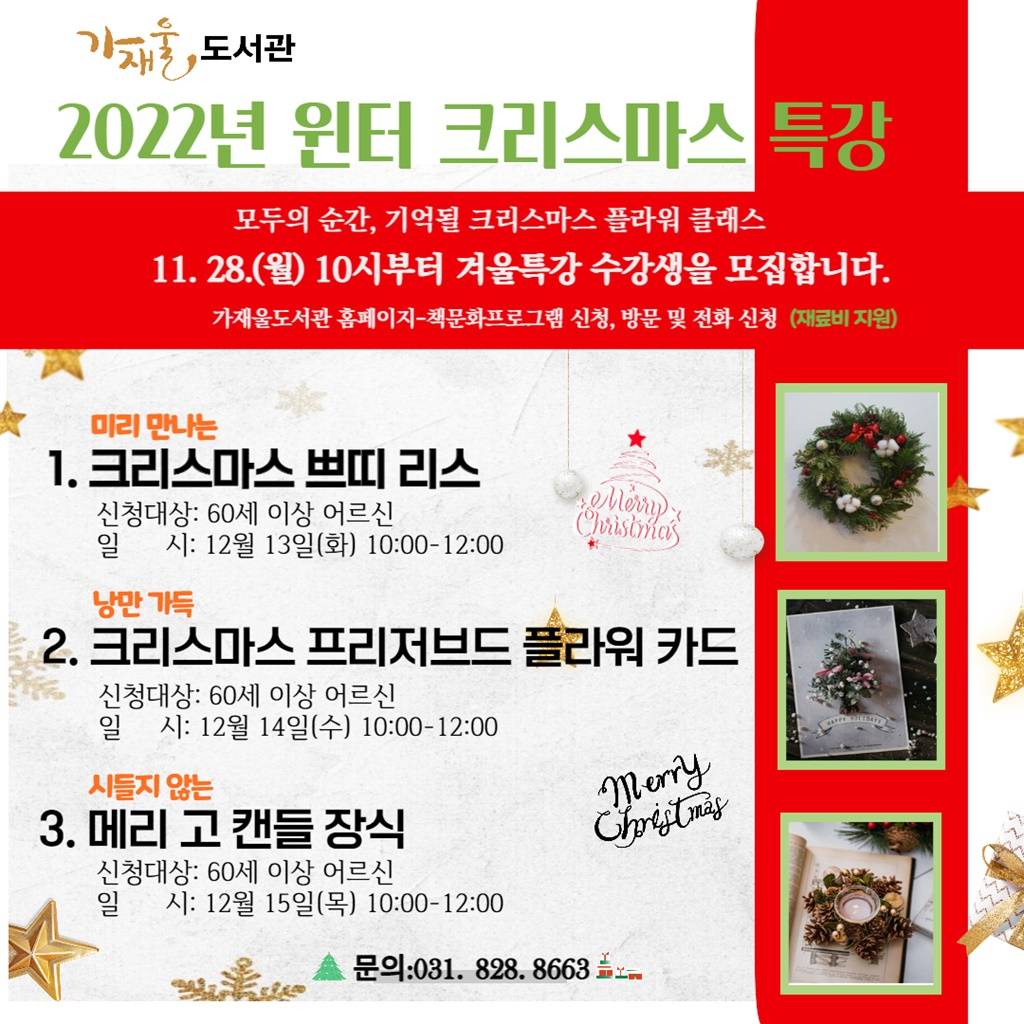 의정부시는 가능역 3번 출구 맞은 편에 위치한 가재울도서관에서 12월 13일(화)부터 12월 15일(목)까지 60세 이상 어르신을 대상으로 ‘2022년 윈터 크리스마스 특강’을 운영한다.