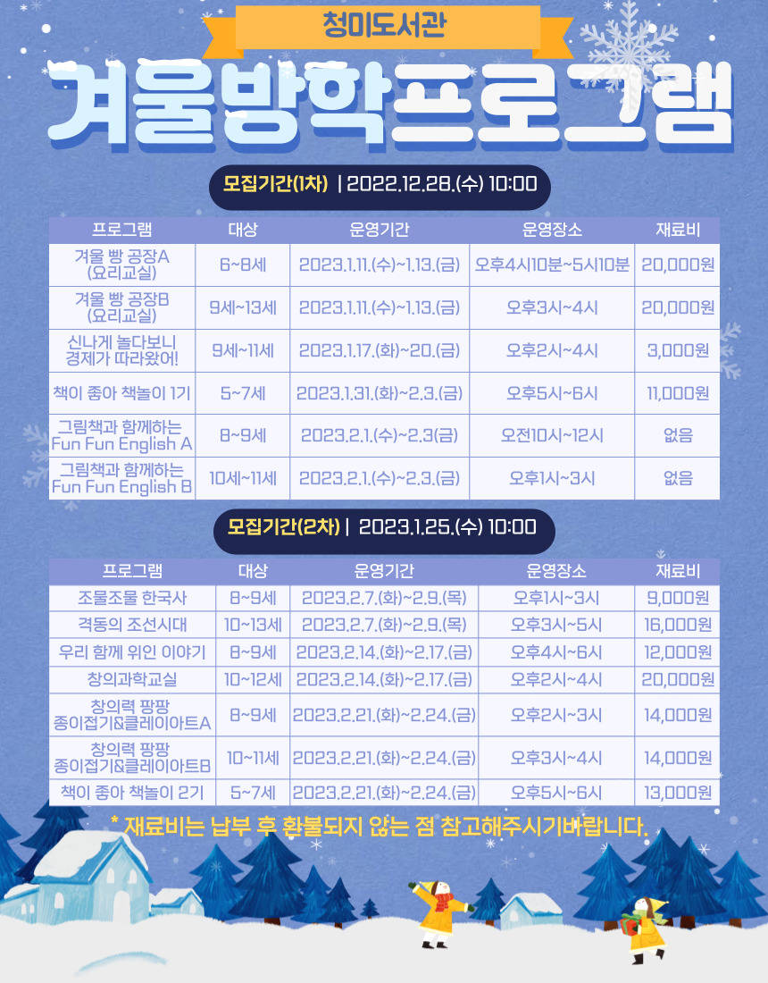 겨울 방학 프로그램은 겨울 빵 공장(요리교실) A(6~8세)/B(9~13세) 신나게 놀다보니 경제가 따라왔어(9~11세) 책이 좋아 책놀이 1기(5~7세) 그림책과 함께하는 Fun Fun English A(8~9세)/B(10~11세) 조물조물 한국사(8~9세) 격동의 조선시대(10세~13세) 우리 함께 위인이야기(8~9세) 창의과학교실(10~12세) 창의력 팡팡 종이접기&클레이아트A(8~9세)/B(10~11세) 책이 좋아 책놀이 2기(5~7세)로 평소 이용자들이 선호하는 주제로 진행할 계획이다.