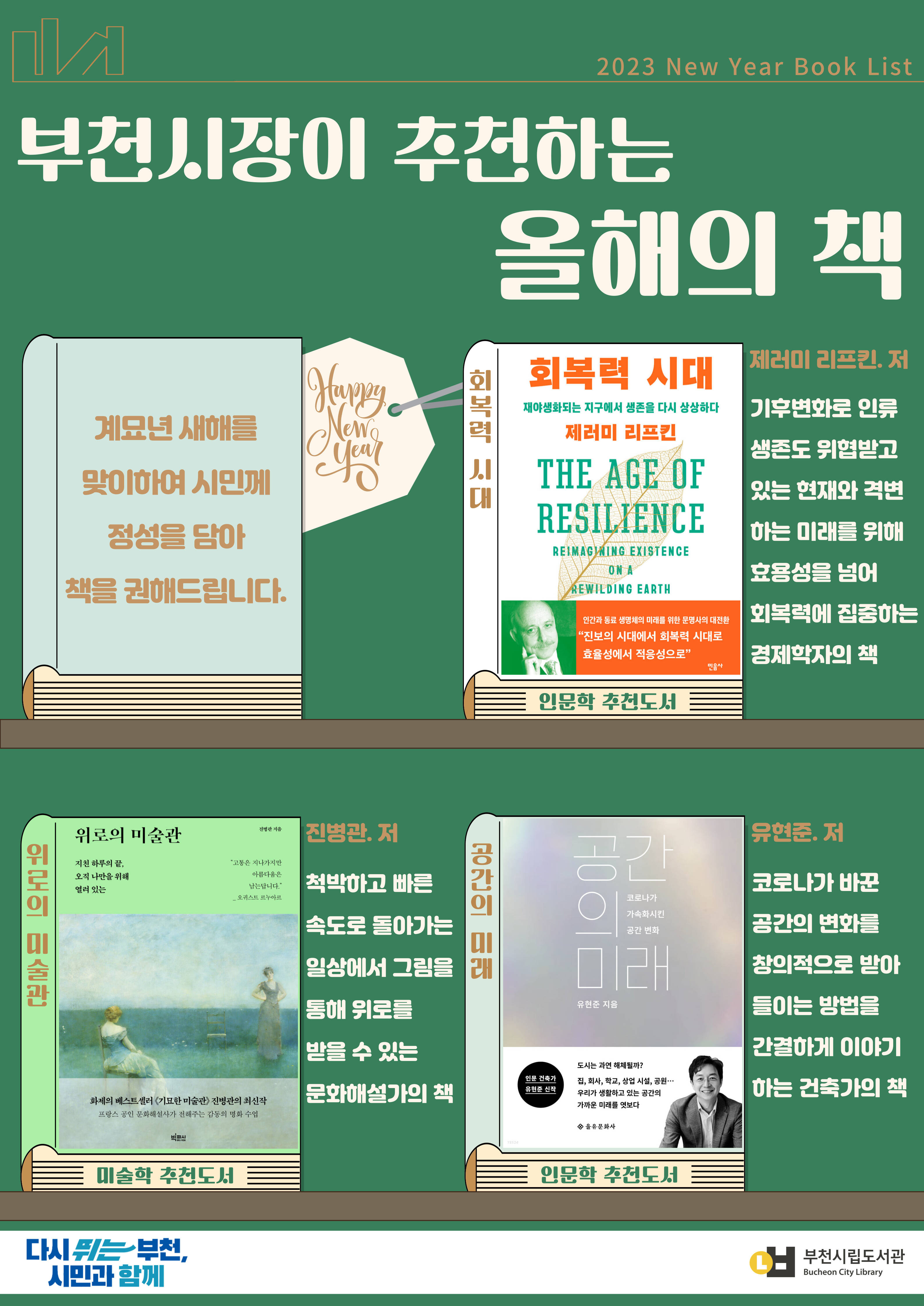 2023년 계묘년 새해를 맞이하여 조용익 부천시장이 힘든 여정을 함께한 시민들에게 위로와 통찰력을 줄 수 있는 책 세 권을 추천했다.조용익 부천시장은 시민이 새로운 내일을 준비하는 데 도움이 되도록 미래사회 핵심가치를 담은 ‘회복력 시대’ 손꼽았다. 이 책은 경제학자 제러미 리프킨이 썼으며 기후변화로 인류 생존이 위협받고 있는 현재와 격변하는 미래를 위해 효용성을 넘어 회복력을 알아볼 수 있는 책이다.