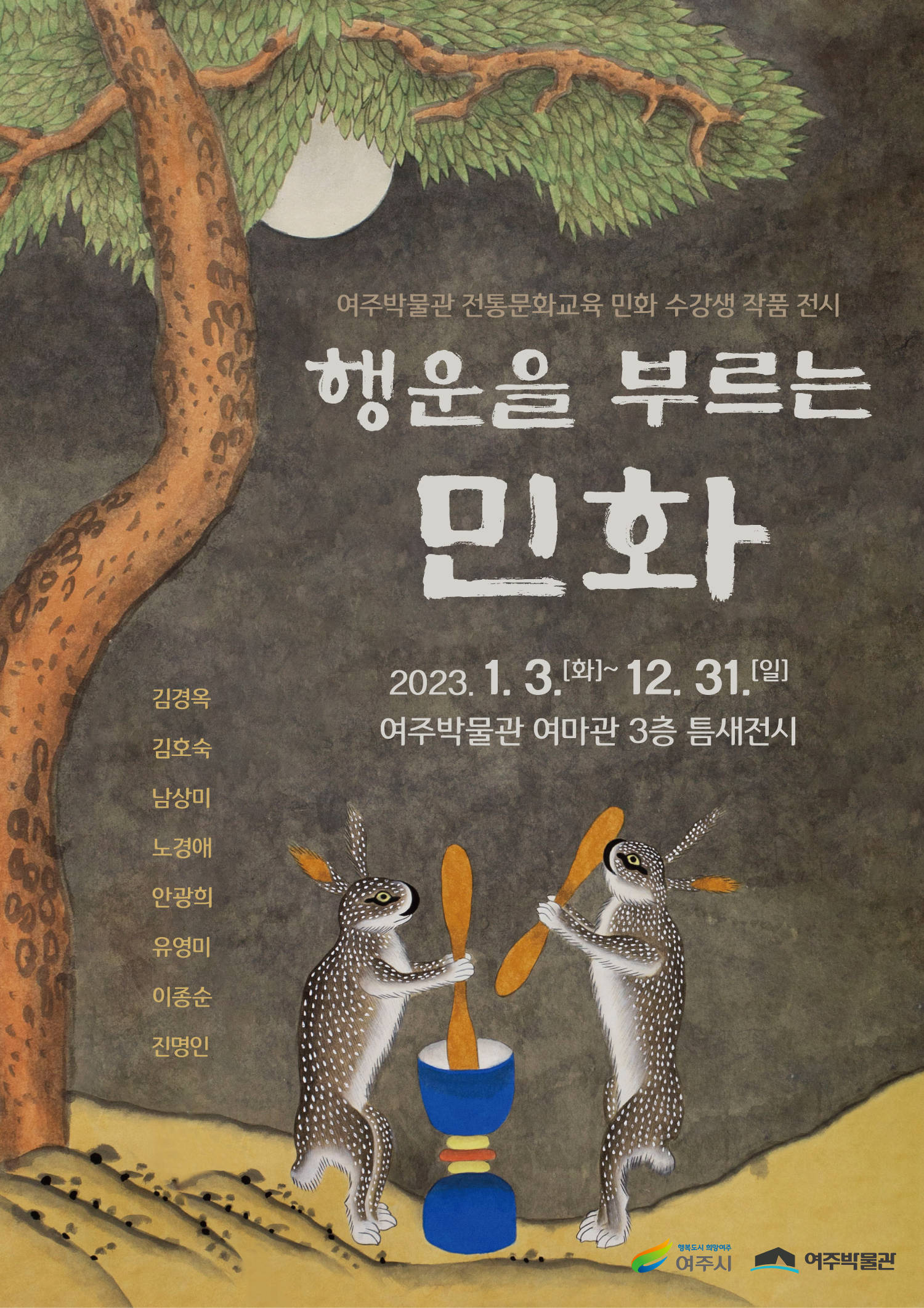 1월 3일(화)부터 여주박물관 여마관 2층과 3층 틈새전시 공간에서는 박물관 전통문화교육 ‘민화’와 ‘닥종이 인형 공예’ 수강생들의 작품전시회를 개최한다. 계묘년을 맞이하여 풍요와 행운을 상징하는 ‘토끼’를 주제로 ‘방아 찧는 토끼’와 ‘수궁설화도’ 등 민화 작품 8점과 자신이 가장 행복했던 순간을 닥종이 인형으로 표현한 작품 5점을 전시한다.
