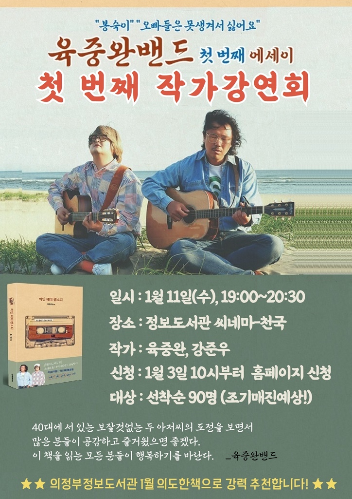 <끼인 세대 랩소디>는 생활밀착형 일상의 언어로 감성 넘치는 노래를 만드는 육중완밴드의 첫 번째 에세이로, B급 감성의 매력으로 가사에 담긴 인생 이야기를 담은 수필집이다. 1월 11일(수), 19시에 책의 저자인 육중완 밴드의 육중완, 강준우 작가를 직접 초청해 책에 얽힌 뒷이야기와 노래의 작사 과정에 대한 에피소드를 이야기할 예정이다.
