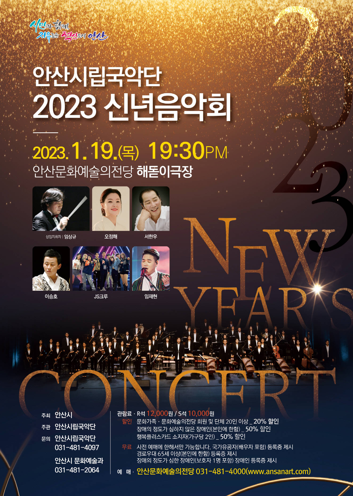 이민근 안산시장은 “이번 신년 음악회를 통해 관객 여러분께 새해의 희망과 활기를 전달할 예정”이라며 “안산시립국악단이 전하는 국악 고유의 흥과 신명나는 리듬을 통해 계묘년의 힘찬 기운을 가득 담아가시길 기원한다”고 말했다.