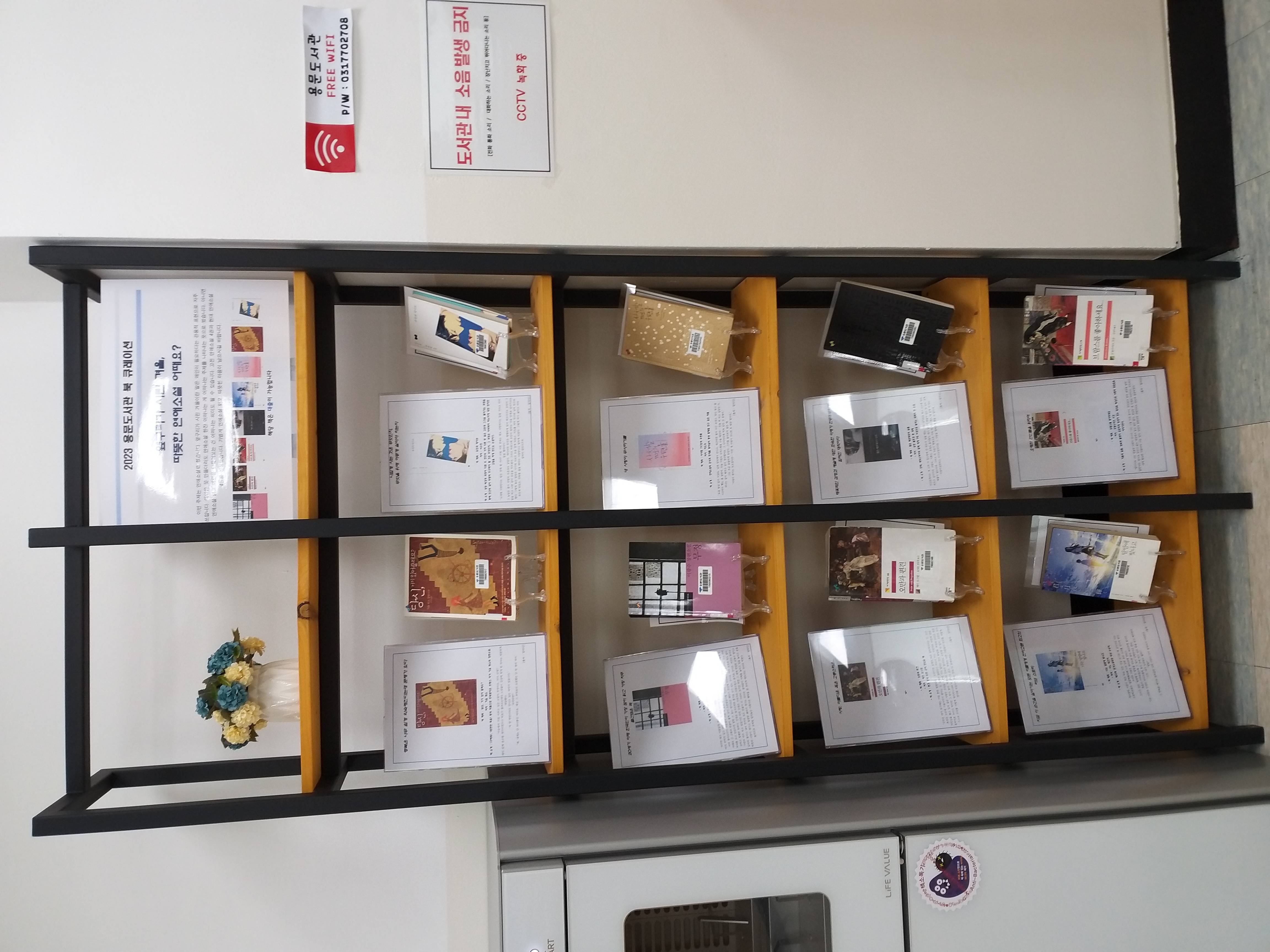 용문도서관에서 선별한 책은 춘원 이광수의 ‘무정’ 제인 오스틴의 ‘오만과 편견’ 프랑수아즈 사강의 ‘브람스를 좋아하세요’ 요한 볼프강 폰 괴테의 ‘젊은 베르테르의 슬픔’ 사노 테츠야의 ‘너는 달밤에 빛나고’ 이도우의 ‘사서함 110호의 우편물:윈터 에디션’ 기욤 뮈소의 ‘당신, 거기 있어 줄래요?’ 서수진의 ‘유진과 데이브’ 등 총 8권이다.