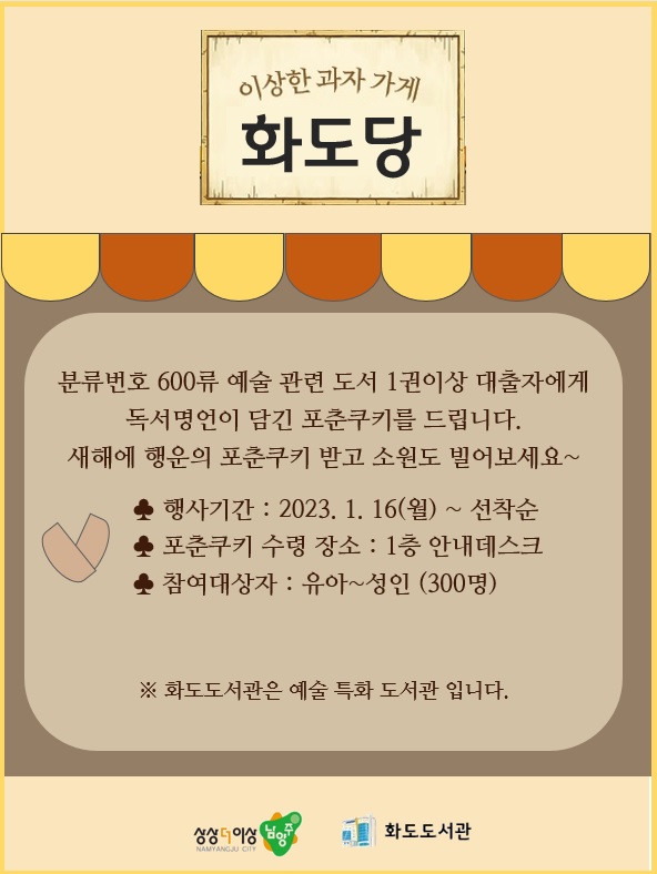 남양주시 화도도서관은 새해를 맞아 자료실 행사 ‘이상한 과자 가게 화도당’을 운영한다.