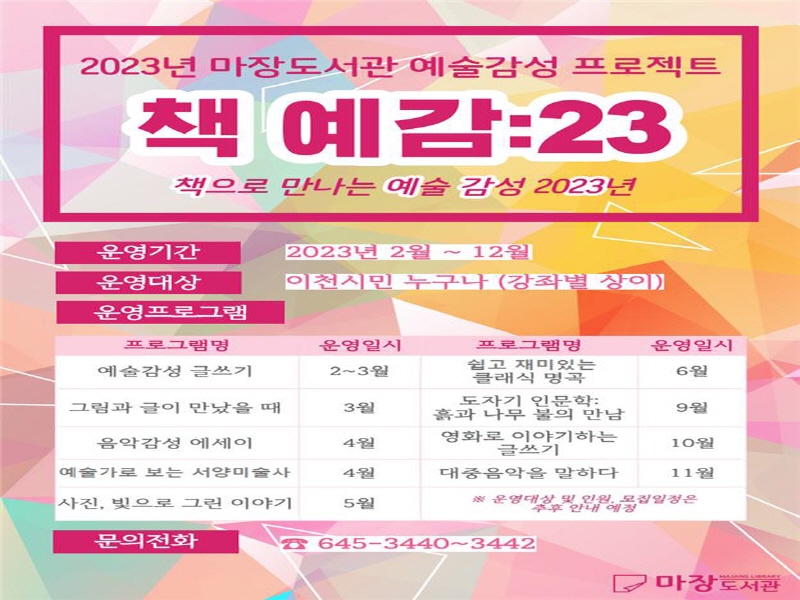 이천시립마장도서관에서는 2023년 책과 예술을 연계한 예술감성 프로젝트 「책 예감:23」를 진행한다.