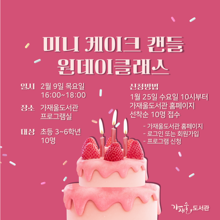 의정부시는 가재울도서관에서 2월 9일 초등 3~6학년 어린이들을 대상으로 사서컬렉션 연계프로그램 ‘미니 케이크 캔들 원데이클래스’를 운영한다고 밝혔다.