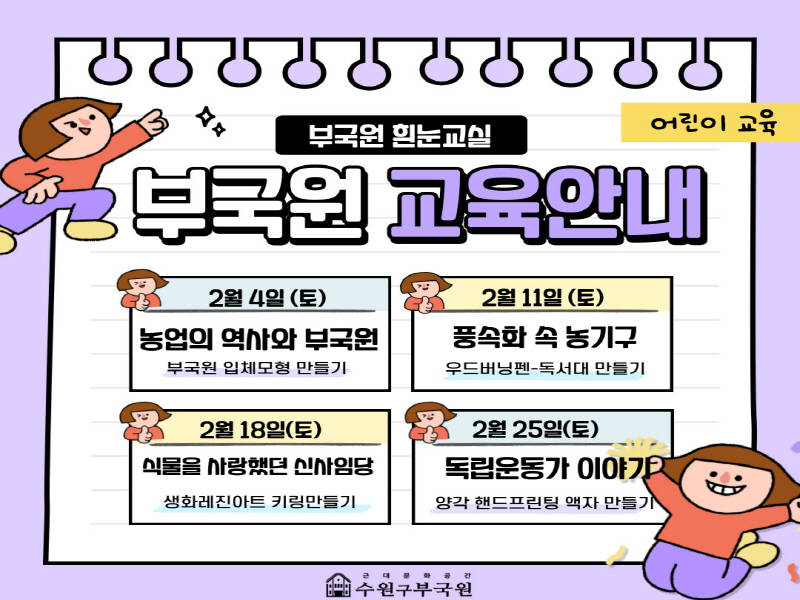 교육은 2월 한 달 간 매주 토요일마다 수원 구 부국원 3층 교육실에서 어린이(초등학생)반(오전 10시30분), 성인반(오후 2시)으로 나눠 운영된다.