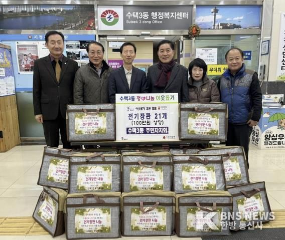 한방통신사 신유철기자 기자 | 구리시 수택3동주민자치회는 지난 29일 수택3동의 어려운 이웃들이 따뜻하게 겨울을 날 수 있도록 온열제품(전기장판)을 저소득 어르신 21가정에 전달했다.