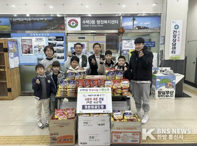 한방통신사 신유철기자 기자 | 구리시 수택3동행정복지센터는 지난 4일 정훈태권도장으로부터 관원들과 지도진이 십시일반 모은 ‘사랑의 라면’ 662개를 전달받았다.