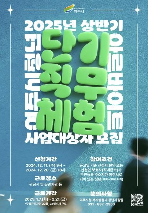 한방통신사 신유철기자 기자 | 여주시는 청년들에게 공공기관에서 직무 경험을 제공하고 경제적 자립을 지원하기 위해 ‘2025년 상반기 청년 단기 직무체험 아르바이트’를 모집한다고 밝혔다.