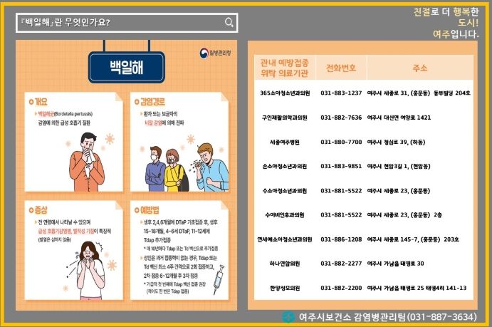 한방통신사 신유철기자 기자 | 여주시보건소 보건행정과는 최근 전국적인 백일해 유행과 첫 사망자(생후 2개월 미만)가 발생함에 따라 백일해 예방접종을 적극 당부했다.