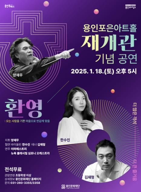 한방통신사 신유철기자 기자 | 용인문화재단은 오는 1월 18일 객석 증축 공사를 마치고 새롭게 단장한 용인포은아트홀에서 정통 클래식 장르로 100여 명의 연주자가 출연하는 재개관 기념 공연 ‘환영’을 개최한다.