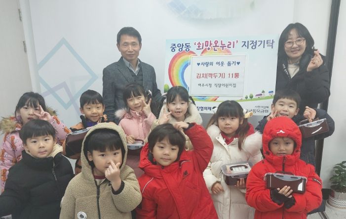 한방통신사 신유철기자 기자 | 20일 여주시청 직장어린이집에서 6~7세 원아 10여명이 함께 담근 깍두기 11통을 중앙동행정복지센터에 기탁했다.