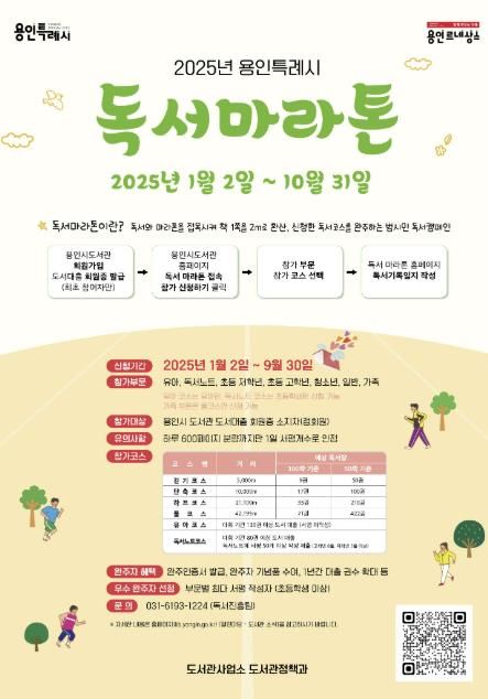 독서와 마라톤을 접목한 이 대회는 2016년 시범운영으로 시작해 현재는 용인특례시의 대표적인 독서 활성화 프로그램으로 자리 잡았다. 책을 읽고 서평을 작성하면 책 1쪽을 2m로 환산해 목표 거리에 도달하게 되고, 자신이 설정한 독서 코스를 완주해 나가는 독서 캠페인이다.