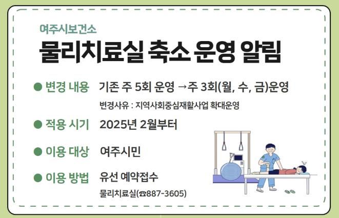 현재 여주시보건소 물리치료실은 예약제로 운영하며 여주시민을 대상으로 근골격계, 만성퇴행성 질환 통증 등 물리치료와 온열․전기 치료를 제공하고 있으며, 65세 이상의 경우 무료로 진료 가능하다.