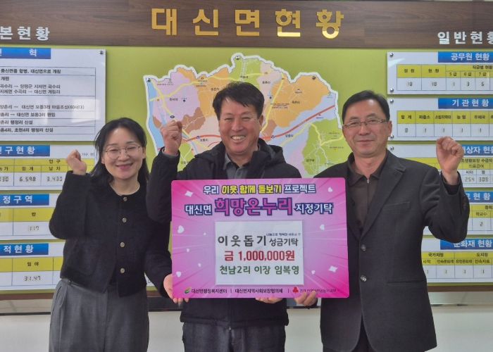 장홍기 대신면장은 “12년째 한결같이 대신면민을 위해 이웃돕기 성금을 기탁해 주시는 임복영 천남2리 이장님께 감사드리며, 따뜻한 마음을 우리 이웃들에게 잘 전달해 드리도록 노력하겠다.”고 전했다.