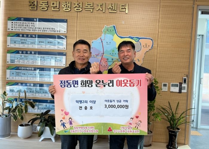 덕평2리 이장(전충호)은 “어려운 이웃들이 따뜻한 겨울을 보낼 수 있도록 작은 힘이나마 보탬이 되고자 기탁하게 됐다. 앞으로도 지역사회의 일원으로서 나눔을 실천하며 더 나은 점동면을 만들기 위해 지속적으로 노력하겠다.” 라고 말했다.