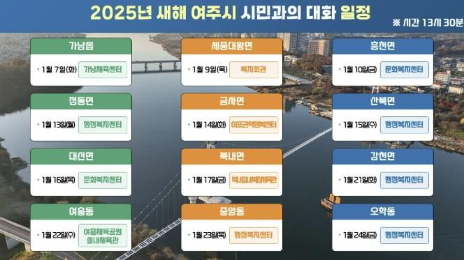 ‘2025년 새해 시민과의 대화’는 △2025.1.7.(가남읍, 가남체육센터) △2025.1.9.(세종대왕면, 복지회관) △2025.1.10.(흥천면, 문화복지센터) △2025.1.13.(점동면, 행정복지센터) △2025.1.14.(금사면, 이포권역행복센터) △2025.1.15.(산북면, 행정복지센터) △2025.1.16.(대신면, 문화복지센터) △2025.1.17.(북내면, 북내실내복합체육관) △2025.1.21.(강천면, 행정복지센터) △2025.1.22.(여흥동, 여흥체육공원 실내체육관) △2025.1.23.(중앙동, 행정복지센터) △2025.1.24.(오학동, 행정복지센터) 순으로 진행된다.