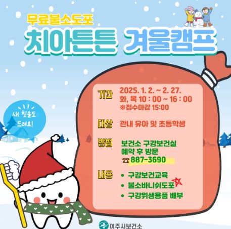 한방통신사 신유철기자 기자 | 여주시 보건소는 겨울방학을 맞아 유아동 대상 무료불소도포사업 '치아튼튼 겨울캠프'를 1월 2일부터 운영할 예정이다.