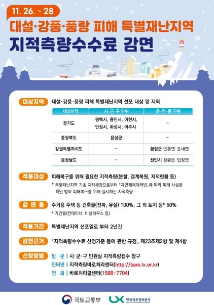 주거용 주택과 건축물 등(전파·유실)의 지적측량 수수료는 100%가 감면된다. 기타 토지와 시설(컨테이너, 비닐하우스 등 가건물)의 감면율은 50%다.