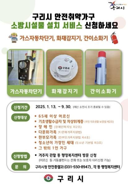 백경현 구리시장은 “65세 이상 홀로 어르신 등 안전취약가구를 대상으로 소방시설물을 보급하여, 가스·화재사고로 인한 인명 피해를 방지하고 생활안전 관리에 소외되는 분들이 없도록 꼼꼼히 살펴 지원하겠다.”라고 전했다.