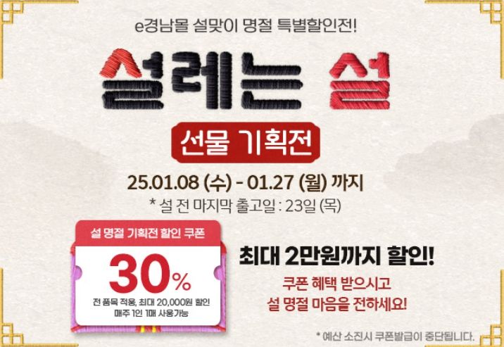 이번 설 기획전에는 도내에서 생산된 쌀, 떡, 차, 김, 달걀, 한우, 전통주 등 e경남몰에 입점 중인 다양한 상품과 선물 세트를 준비했으며, 30% 할인쿠폰(최대 2만 원)을 발행한다.